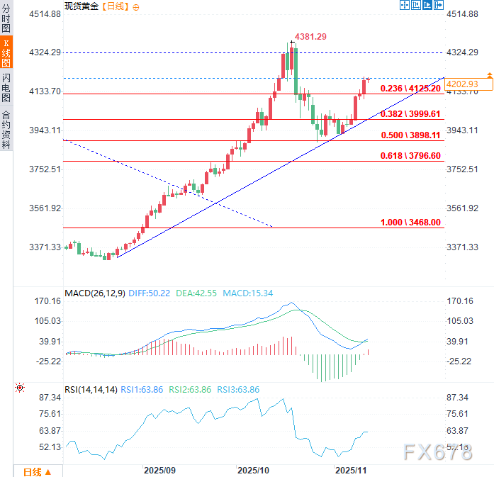 汇通财经APP讯——周四(11月13日),现货黄金连续第五个交易日上涨,目前累计涨幅约5.5%,金价站上每盎司4200美元。近期买盘压力持续坚挺,主要受美联储可能实施更宽松货币政策的预期支撑,该预期导致美元走弱并提振黄金需求。若这一政策前景持续,未来几个交易日看涨动能或将进一步增强。
