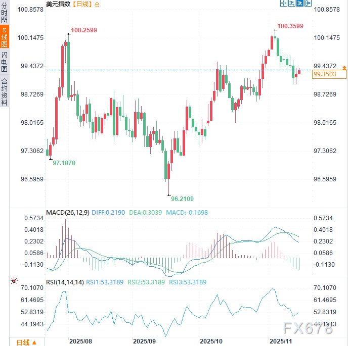 周一(11月17日)美元指数延续前一交易日涨势,微涨0.08%至99.35附近。