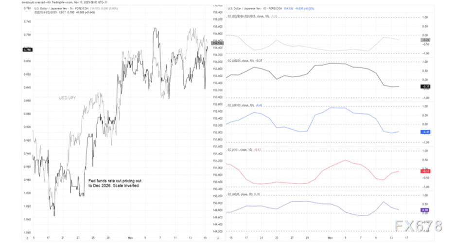 近期美国利率与美元/日元之间的紧密关联显著弱化,如下方右栏的10日滚动相关系数所示——无论是反映截至2026年底美联储降息预期的灰度曲线,还是分别代表两年期与十年期美债收益率的黑/蓝色曲线,均未与汇率波动形成有效联动。这暗示除美国利率预期外,其他因素正在主导汇率走势。值得注意的是,该货币对与风险情绪指标同样脱钩:下方VIX恐慌指数(红色)与纳斯达克期货(紫色)未呈现强关联,与各期限日本国债收益率的联动性亦不明显(未图示)。