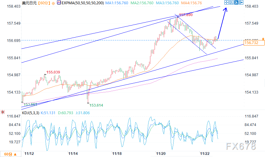 汇通财经APP讯——周一(11月24日)欧盘时段,美元兑日元呈现震荡上行趋势,整体维持在短期均线上方运行,多头动能阶段性占优。