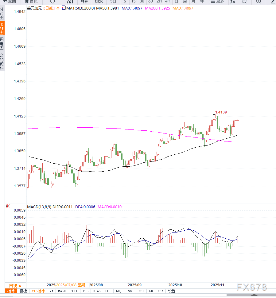 技术面仍明显偏多,但短线超买信号需警惕回调风险。未来三日的美国通胀数据将决定USD/CAD能否突破上行区间,或重新回到1.40附近整固。