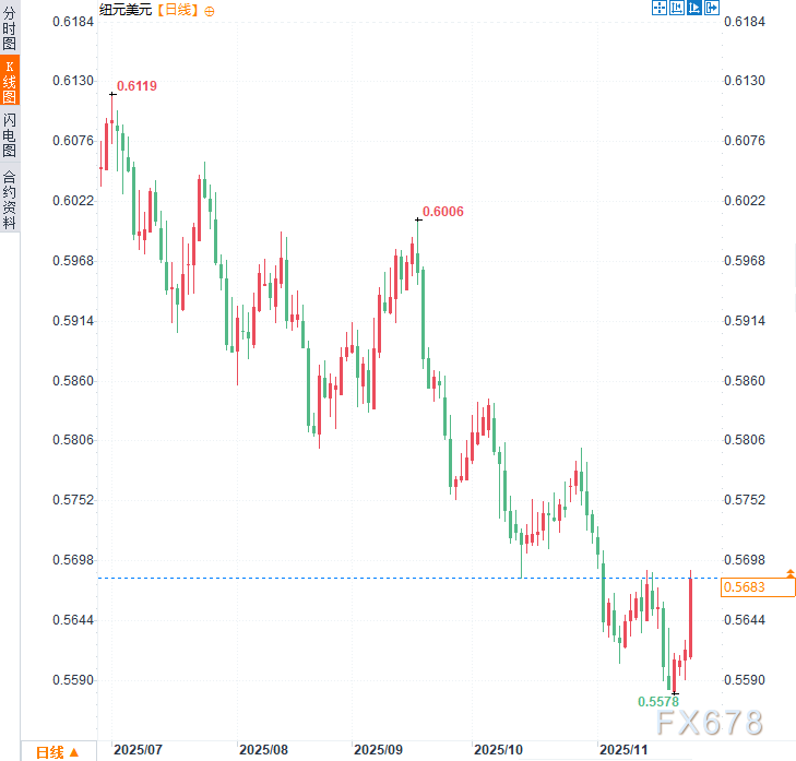 小结:新西兰联储淡化鸽派前瞻指引,对经济前景的预期比较乐观,兼受美元指数跌创逾一周新低,纽元兑美元获得了强劲的上涨动能,此前最高触及0.5691,为11月5日以来新高。新西兰第三季度零售销售数据将于周四公布,前值为季环比增0.5%,同比增2.3%,投资者需要予以关注。