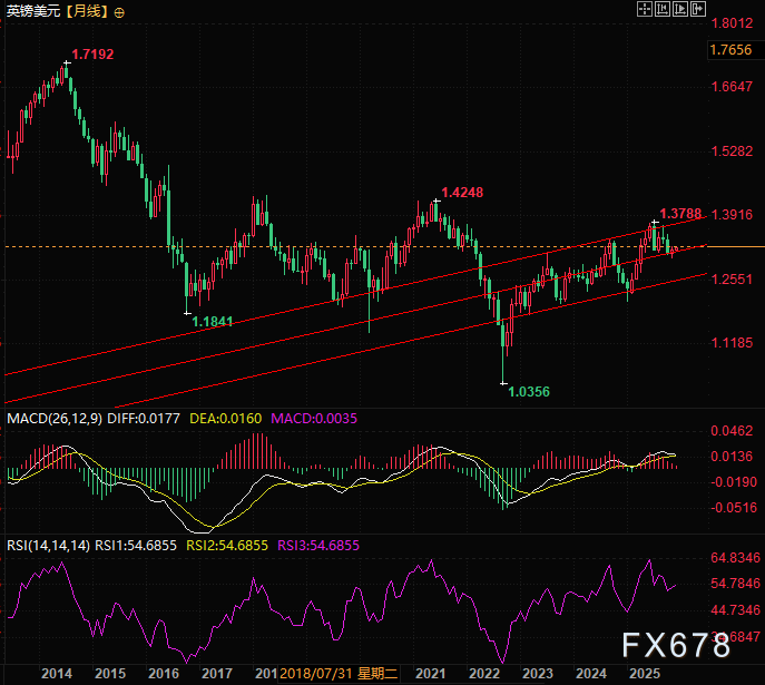 月线级别:底部区域反弹,上升通道支撑有效,英镑兑美元月线显示,汇价仍处于长期底部区域,且始终运行在上升通道内。本次汇价调整至上升通道中轨后迅速展开反弹,表明多头掌控力依然较强,长期反弹趋势未改。