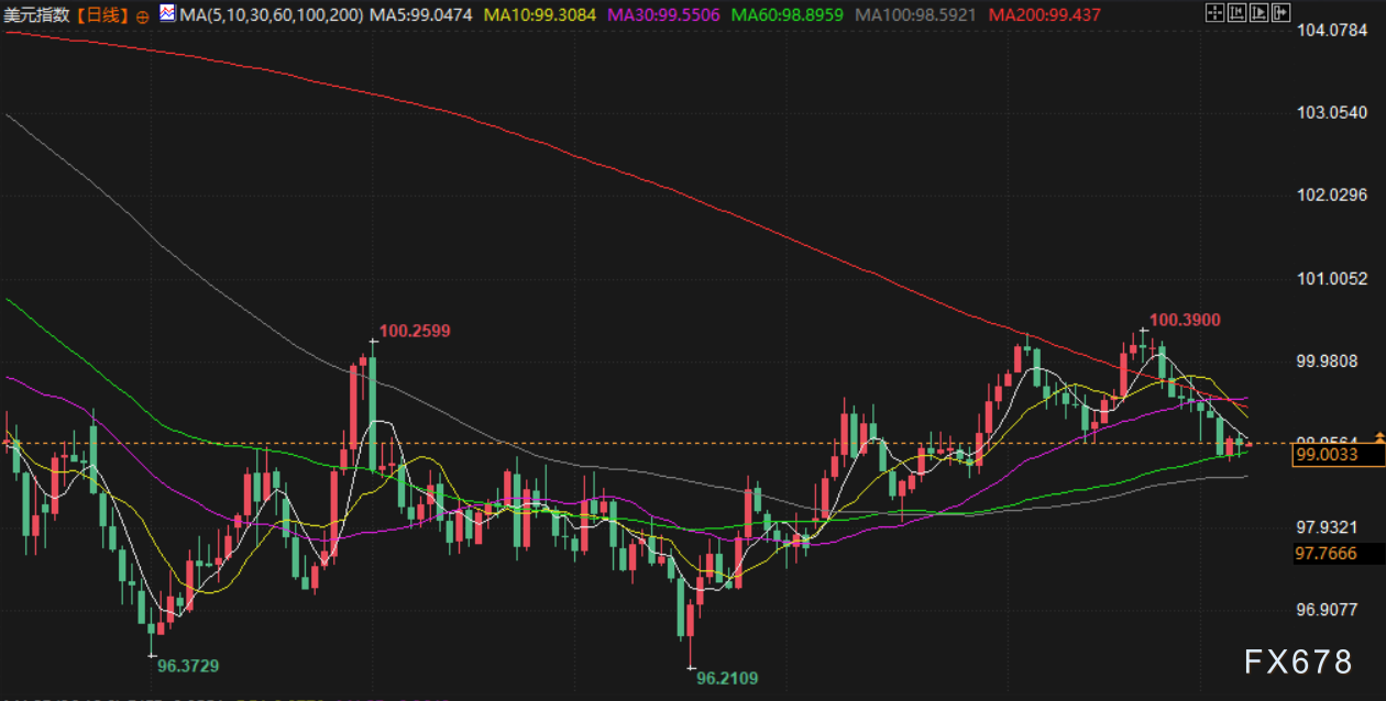 美元指数上周五下跌0.1%,报98.994,接近五周低点,市场交易商普遍关注本周的美联储决议,并预期决策者将在此次会议上决定降息。