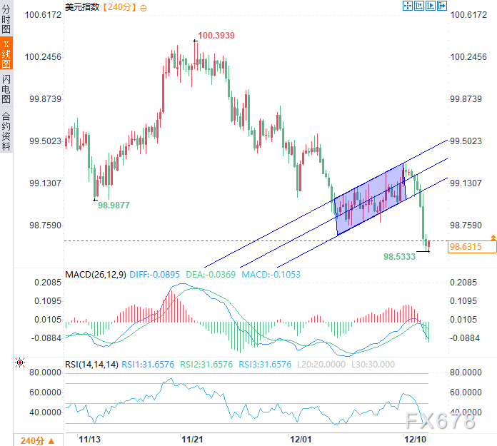 从技术面看,美元指数在决议公布前已形成看跌旗形结构,而这一形态最终演变为破位下行,美元指数正向下一个支撑位98.00滑落。