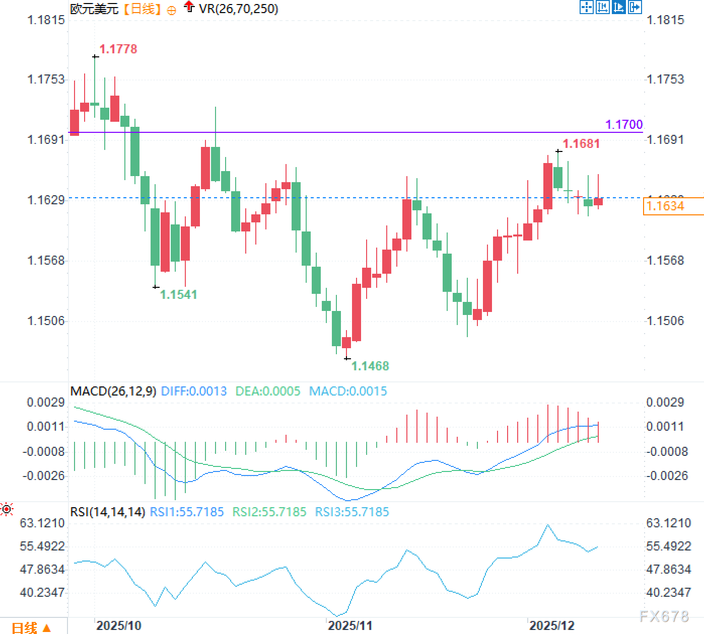 从日线图来看,欧元兑美元近期走势呈现明显的区间震荡格局。汇价自触及1.1468低点后展开反弹,于12月初攀升至1.1681附近遇阻回落,目前在1.1630支撑线附近徘徊整理。