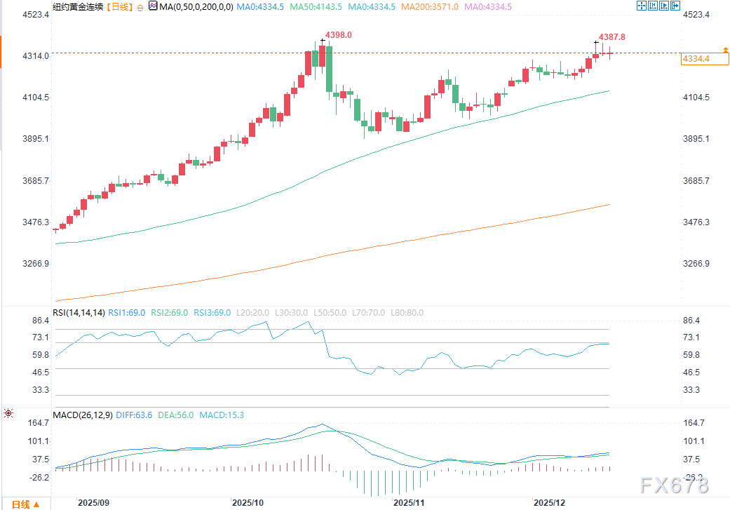 技术面来看,2月黄金期货多头的下一个上行目标是收盘价突破关键阻力位——合约历史高点4433.00美元/盎司。空头的近期下行目标是推动期货价格跌破关键技术支撑位4200.00美元/盎司。第一阻力位见于今日高点4367.90美元/盎司,随后是上周高点4387.80美元/盎司;第一支撑位为隔夜低点4297.40美元/盎司,其次是4250.00美元/盎司。
