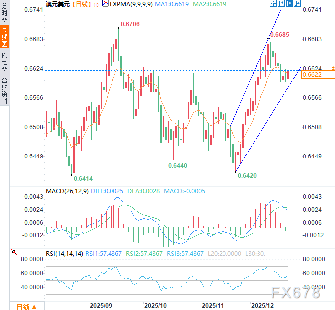 日线图技术分析显示,澳元兑美元正徘徊于上升通道下轨附近,表明整体趋势仍保持看涨且支撑有效,后续价格走势或将提供更明确方向。