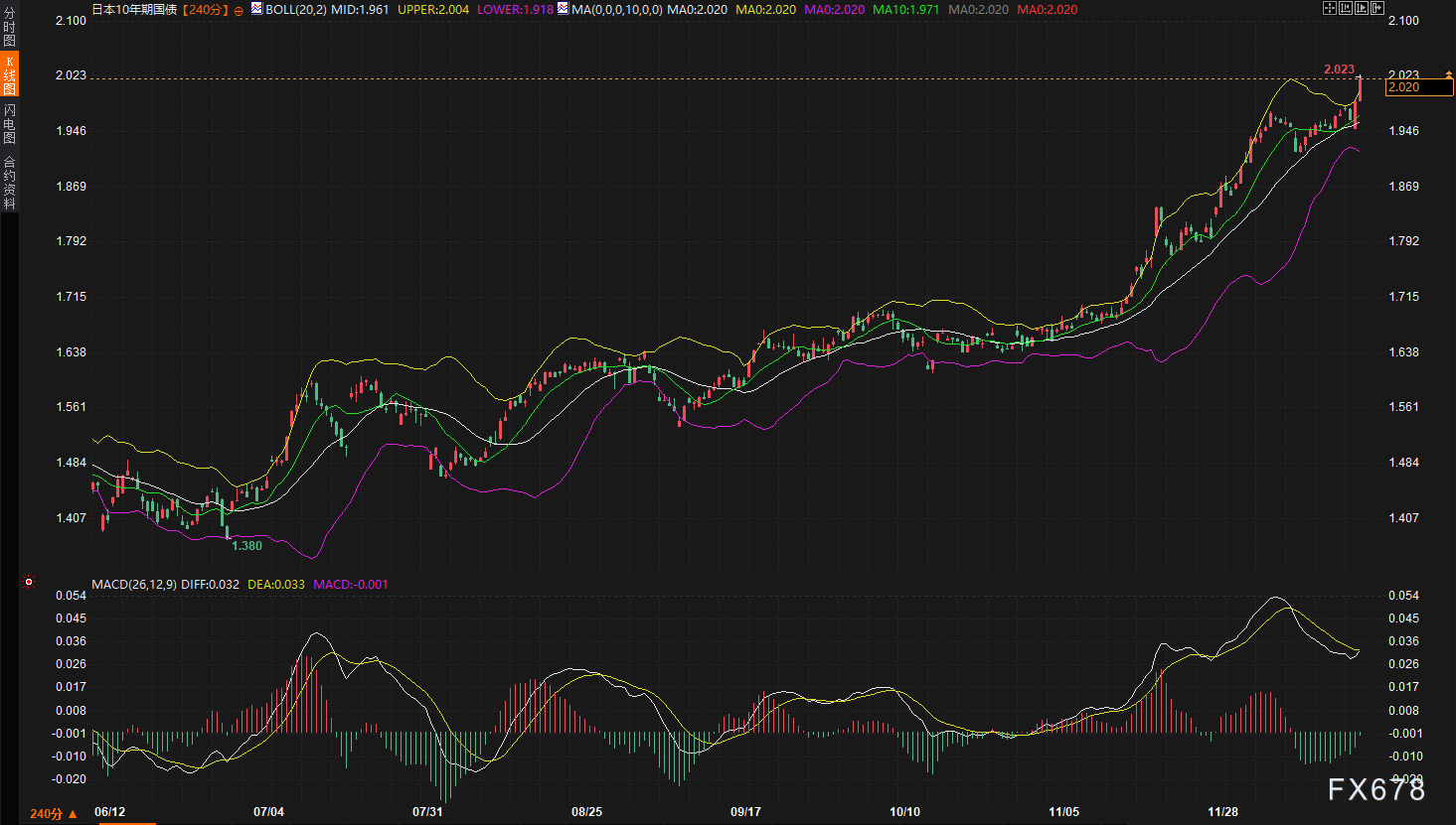 技术面分析强化了这一看空债市的格局。从240分钟图观察,10年期日债收益率报价2.020,不仅稳稳站上布林带(20,2)中轨1.961,更是直接突破上轨2.004,显示上涨动能强劲且已脱离常态波动区间。MACD指标中,DIFF线与DEA线虽接近但均处于零轴上方(0.032, 0.033),表明上升趋势仍在延续。关键的技术突破点在于2.0%这一重要心理及技术关口被有效上穿,且盘中回调乏力,这为收益率进一步上探打开了空间。