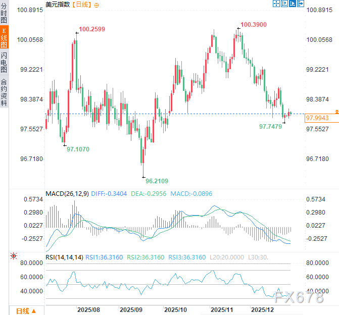 这种深刻结构性矛盾所带来的“内伤”,或许注定了美元指数的长期走势将面临持续的、内生性的下行压力。周一(12月29日)亚市时段,美元指数于98.00附近窄幅震荡,位于10月初以来低点(97.75)附近上方不远处。