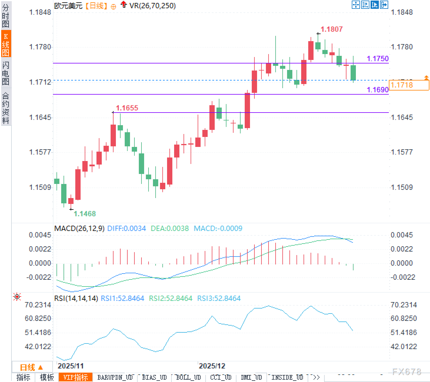 可以看到“基本面压力叠加技术面消化”的特征。日线图上,汇价此前在1.1800上方附近冲高后回落,高点区域接近1.1807,随后进入整理阶段。目前价格处于上方1.1750与下方1.1690之间的夹层区间,显示多空都在等待新的驱动因素来打破平衡。结构上,前期上行推动力度已不如12月中旬顺畅:MACD指标的柱状动能在高位逐步收敛并出现转弱迹象,快慢线高位钝化后开始回落,提示趋势动能正在降温;RSI回落至约52.8附近,脱离此前接近70一带的偏强区域,反映追涨情绪有所减弱,但也尚未进入明显的超卖状态。这种组合更像“高位盘整伴随动能回吐”,并不意味着单一方向已经被市场一致确认。