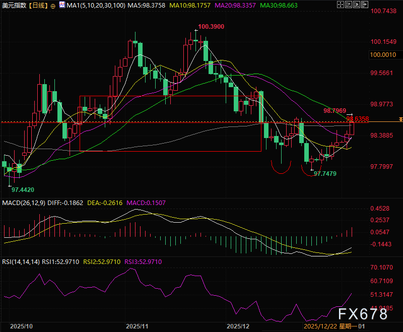 技术面,之前文章写过美元指数或围绕双底展开反弹,目前反弹至关键压力位,98.65为压力位,之后是98.90附近,支撑在98.10附近。