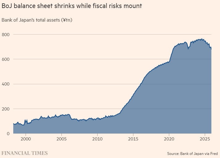 诚然,日本央行的加息步伐一直极其缓慢。行长植田和男(Kazuo Ueda)花了近两年时间才将利率上调至 0.75%(尽管这已是 90 年代以来的最高水平)。然而,尽管在加息上显得拖泥带水,日本央行在撤销另一项遗留政策方面却行动迅速。 在实施量化宽松(QE)的多年间,日本央行为放宽货币环境积累了海量的国债。现在,它正以令人惊讶的速度,允许其中部分持有的债券到期而不进行再融资,实际上将其转回给私营部门投资者——这在本质上就是“量化紧缩”(QT)。